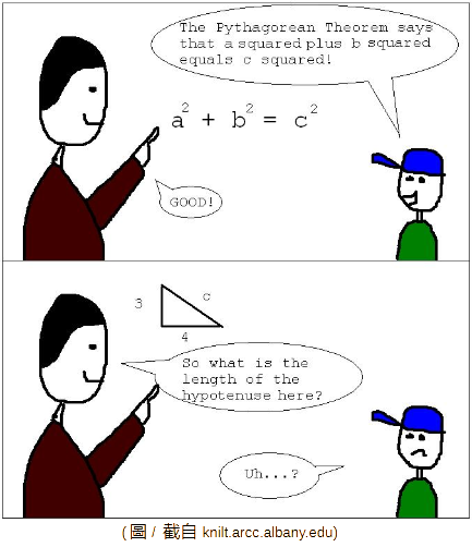 The following comics perfectly and aptly depict the wisdom of Winnie-the-Pooh. The kid has the knowledge of Pythagorean Theorem. He probably knows many other complex theorems too, and can memorize and recite all mathematical formulas correctly. But, he does not have an understanding of the Pythagorean Theorem. He cannot transform knowledge into ability. He is unable to apply his knowledge to solve an actual problem.