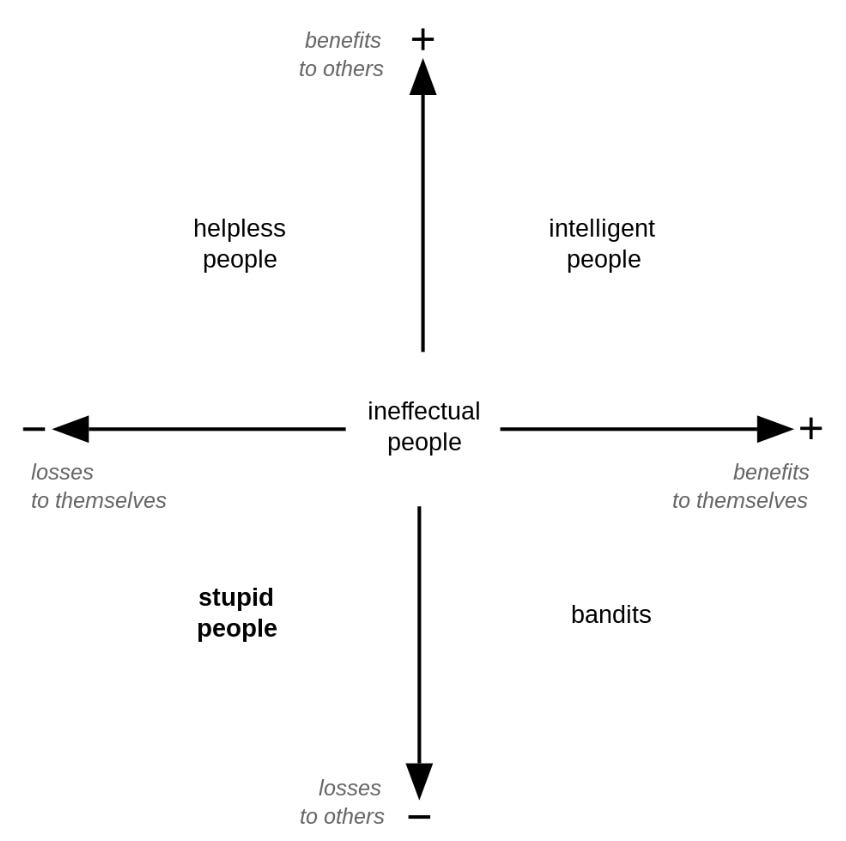 He used X-axis and Y-axis to divide human beings into four categories: the helpless, the intelligent, the bandit and the stupid (see the diagram below). The X-axis measures the benefits and losses caused by one’s actions to oneself; the Y-axis measures the benefits and losses caused by one’s actions to others.